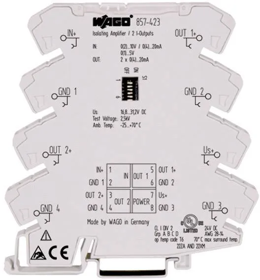 Сигнальный удвоитель 857-423 WAGO. Тип 857-423. Входящий сигнал 0 - 20 мA, 4 - 20 мA, 0 - 5 В, 0 - 10 В, 2 - 10 В, 1 - 5 В. Выходящий сигнал 2 x 0 (4) - 20 мA. Вид С двумя конфигурируемыми выходами по току. Изоляция Полиамид 6.6. Искажение при передаче ? 0,1 %. Линейные размеры 94 x 6 x 96 мм. Потребляемый ток < 35 мА. Питающее напряжение 16,8 - 31,2 В. Сопротивление на входе ? 50 Ом / ? 100 кОм. Интервал температуры От -25 до 70 °C. Соответствие со стандартом качества RoHS Да. Сопротивление нагрузки 2 x 300 Ом. Соединение Пружинное. Конфигурация DIP-Переключатель. Описание Сигнальный удвоитель с двумя конфигурируемыми выходами по току.