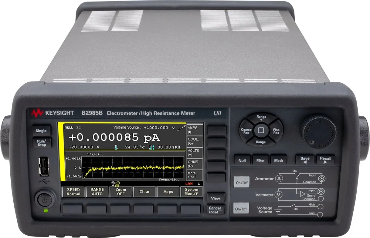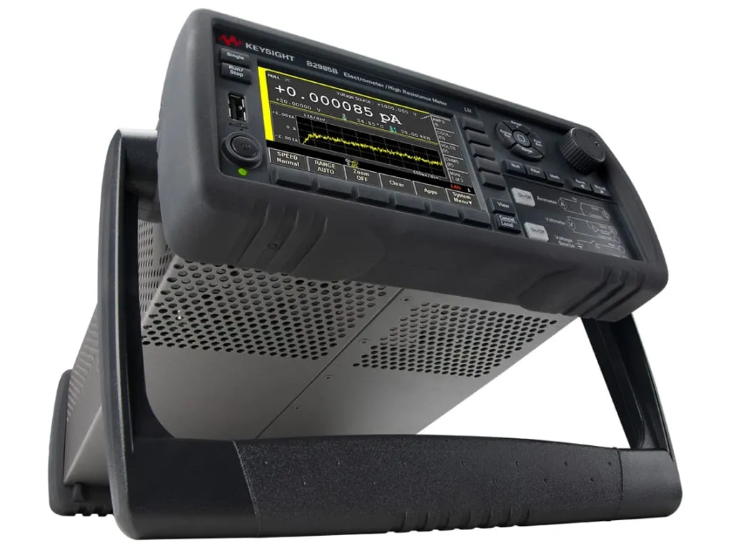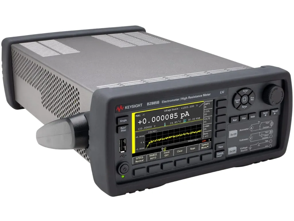 Keysight B2985A — измеритель малых токов с графическим дисплеем, обеспечивает достоверные измерения силы тока с разрешением от 0,01 фА (0,01x10-15 А), а также высокого сопротивления до 10 ПОм (10x1015 Ом).