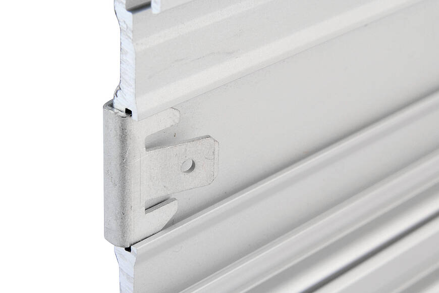 Заземляющий захват впрессовывается в основной профиль. Анодированное покрытие рри монтаже разрывается и обеспечивается надёжный контакт. С помощью обычных имеющихся в торговле кабельных наконечников для плоских разъёмов по DIN 46244-A6.3-0.8 можно реализовать заземление частей корпуса или встраиваемых частей.
